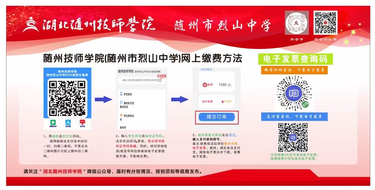大家好!首先祝賀您/您(nín)孩子被隨州技師學院錄取!近日天氣持續高溫炎熱,為確保大家(jiā)的(de)健(jiàn)康與便利,現(xiàn)將繳費及錄取(qǔ)通知書領取事宜(yí)安排如下(xià),請仔細閱讀並(bìng)按要求辦理: